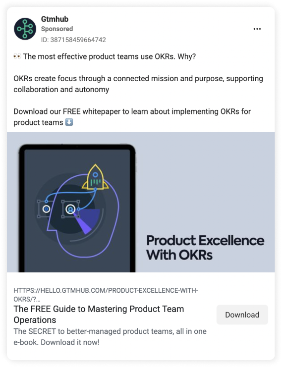 Gtmhub is in the business of helping companies adopt and manage objectives and key results (OKRs). Their Facebook ad is an excellent example of the power of free for SaaS to influence the buyer’s journey.