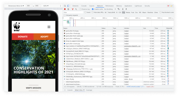 As you can see, all of these images on the WWF homepage are in the jpeg image format. Images have a serious impact on the weight of your website (and so do videos!). Take into consideration whether you actually need all of them and whether they bring any value to the user. To optimize the images you find valuable, you can consider two tactics: